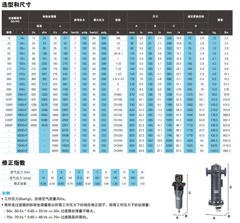 Оваа табела дава информации за филтрите за компримиран воздух и некои специјални апликации. |