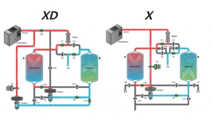 Понатаму, сушарите за компресија на топлина XD или X се навистина сушари со нулта потрошувачка на воздух, кои не трошат енергија или само дел од компримиран воздух за време на фазата на ладно дување.