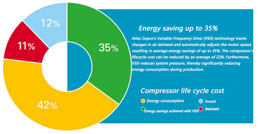 Потрошувачката на енергија сочинува над 80% од вкупните трошоци за животниот циклус на компресорот за воздух со завртки без масло. Понатаму, електричната енергија што се користи во производството на компримиран воздух сочинува над 40% од вкупните трошоци за електрична енергија на фабриката. За да ги намали трошоците за енергија, Atlas Copco беше пионер во технологијата за погон со променлива фреквенција (VSD) во индустријата за компримиран воздух. VSD не само што заштедува значителни количини на енергија, туку и ја штити животната средина за идните генерации. Благодарение на континуираното инвестирање во оваа технологија, Atlas Copco може да го понуди најширокиот опсег на интегрирани VSD компресори на пазарот.