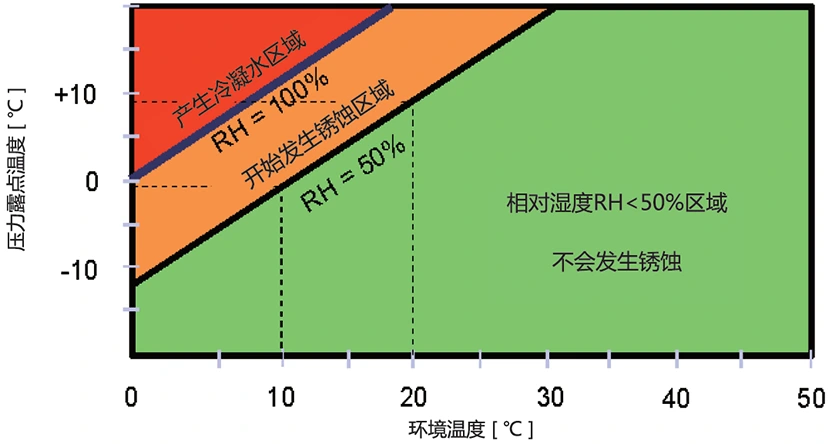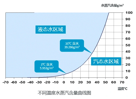 Сликата покажува дека воздухот содржи различни количини на водена пареа на различни температури. Воздухот се лади, а нивото на водена пареа исто така се намалува. Кривата има точки кои ги означуваат нивоата на заситена водена пареа. Температурата за секоја од овие точки е точка на росење. Пониска точка на росење значи помалку водена пареа во компримираниот воздух. Машините за ладење на воздухот го користат ова физичко правило. Тие дозволуваат компримиран воздух да ја замени топлината со средство за ладење. Оваа акција ја намалува температурата на компримираниот воздух. Водената пареа на изладениот воздух се претвора во течна вода. Оваа течност се исцедува од системот. На пример, содржината на заситена водена пареа во компримиран воздух на 35℃ е 39,286 g/m³. По размена на топлина со средството за ладење и ладење до 3℃, содржината на заситена водена пареа е 5,953 g / m³. Разликата од 33,333 g/m³ ја покажува количината на вода отстранета по ладењето и дехидрацијата од машината за сушење замрзнување. Односно, откако компримираниот воздух ќе помине низ машината за замрзнување, приближно 85% од влагата се отстранува, осигурувајќи дека сушењето на компримираниот воздух ги исполнува барањата на производниот процес.