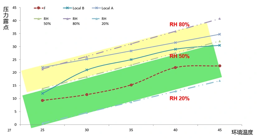 Како што е прикажано во измерените податоци подолу, со влезен притисок на компримиран воздух од 7 Bar, влезна температура од 35°C, точка на росење под притисок од 7°C и конечна температура на издувните гасови од 25°C, релативната влажност на воздухот е 30%, ефикасно спречувајќи ја корозијата на цевководите и опремата што користи воздух.