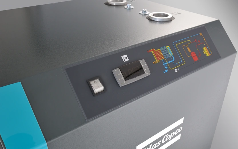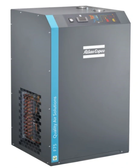 Фен за ладење за ладење Atlas Copco F-тип користи разменувач на топлина три-во-едно кој комбинира сепаратори воздух/воздух, воздух/ладилно средство и вода. Ова ефикасно ја отстранува течната вода одвоена по ладењето и претходно го лади компримираниот воздух, подобрувајќи ја ефикасноста на размена на топлина.