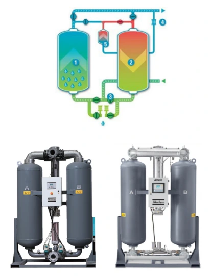 Машините за сушење со микро-топлинска регенеративна адсорпција од серијата А користат средство за сушење за да ја апсорбираат влагата од компримиран воздух. Секоја машина се состои од две идентични кули. Тие ги менуваат функциите по секој циклус.