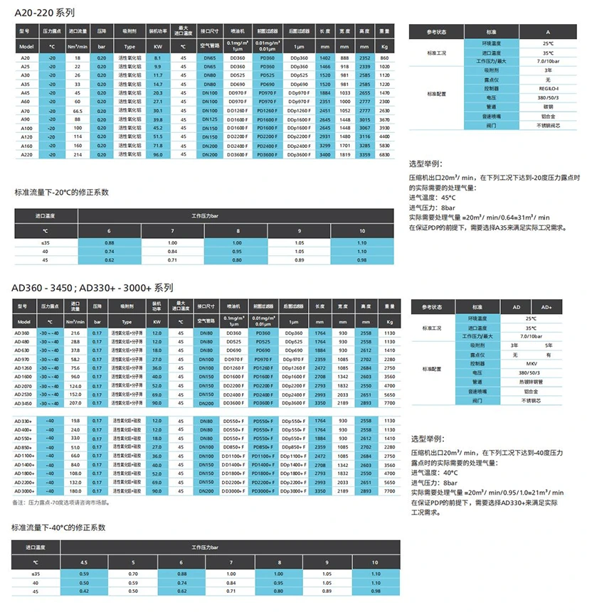 Во зависност од точката на росење под притисок, сушењето може да биде алуминиумско или молекуларно сито материјали. Точката на росење со најнизок притисок може да достигне -70°C.