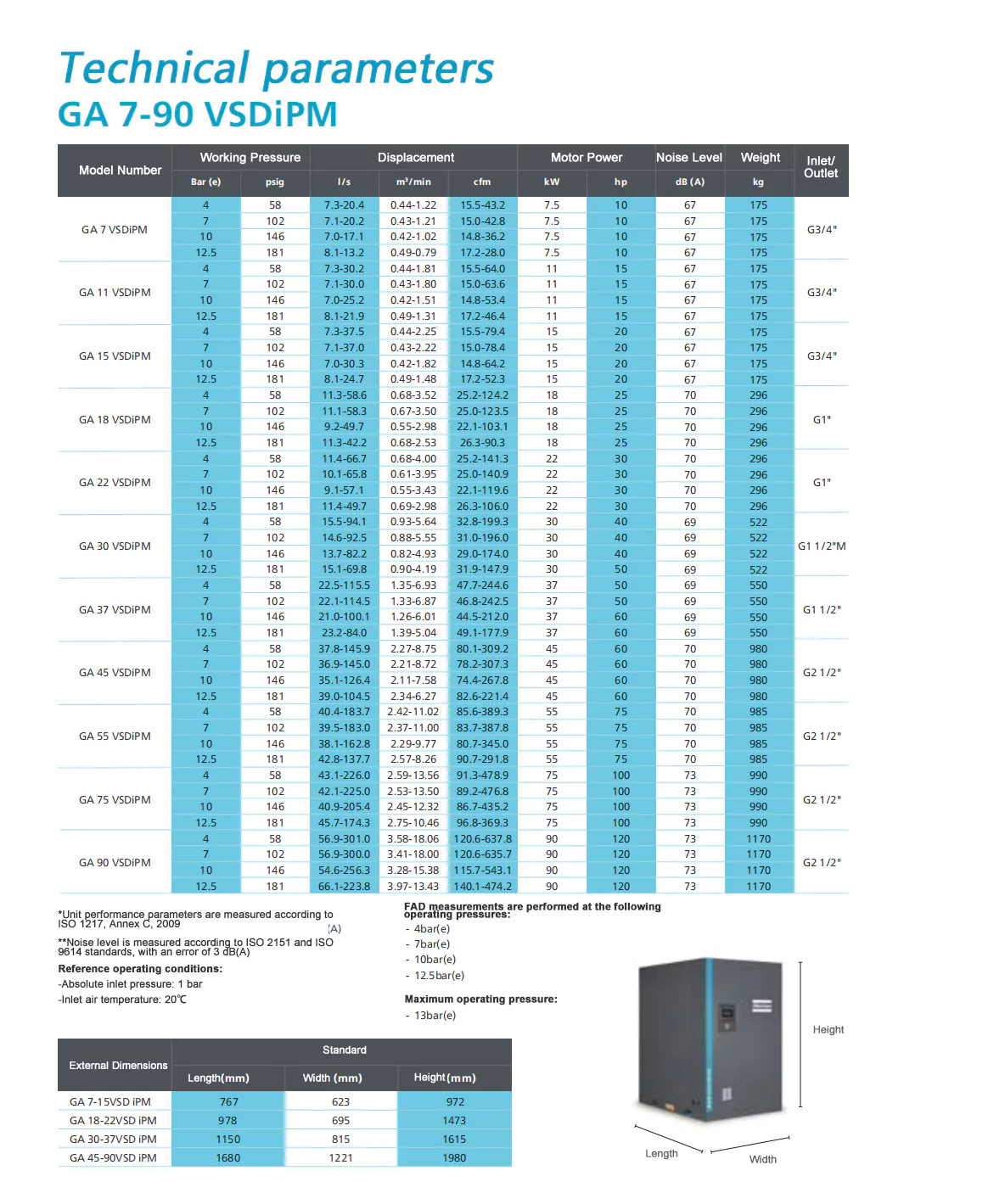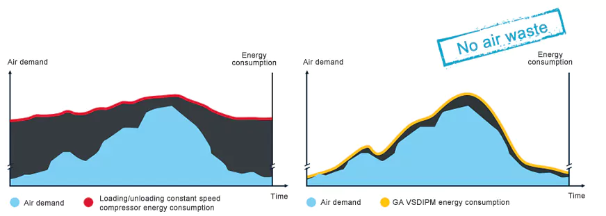 Серијата VSDiPM на Atlas Copco може автоматски да ја прилагоди брзината на моторот за прецизно да ги контролира и да ги исполни барањата за користење гас на клиентите. Во споредба со компресорите управувани од одредената брзина, VSD компресорот за воздух со променлива фреквенција заштедува во просек до 35% од енергијата.