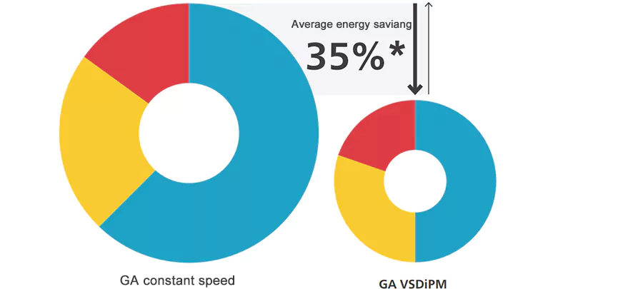 Високо ефикасните компресори од серијата VSDiPM заштедуваат во просек до 35%* енергија во споредба со компресорите што се возат со одредена брзина
